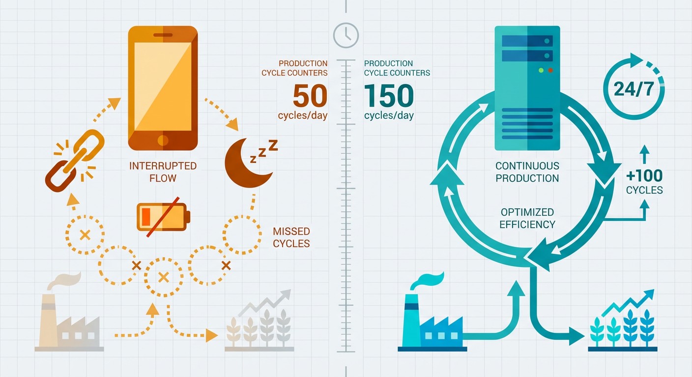 Here's the efficiency gain: On a regular phone, you might complete 40-50 production cycles per day (limited by when you can physically check your phone). With FoxPhone running 24/7, you can complete 120-150 cycles daily because production never pauses for sleep, dead batteries, or you watching Netflix on your phone.