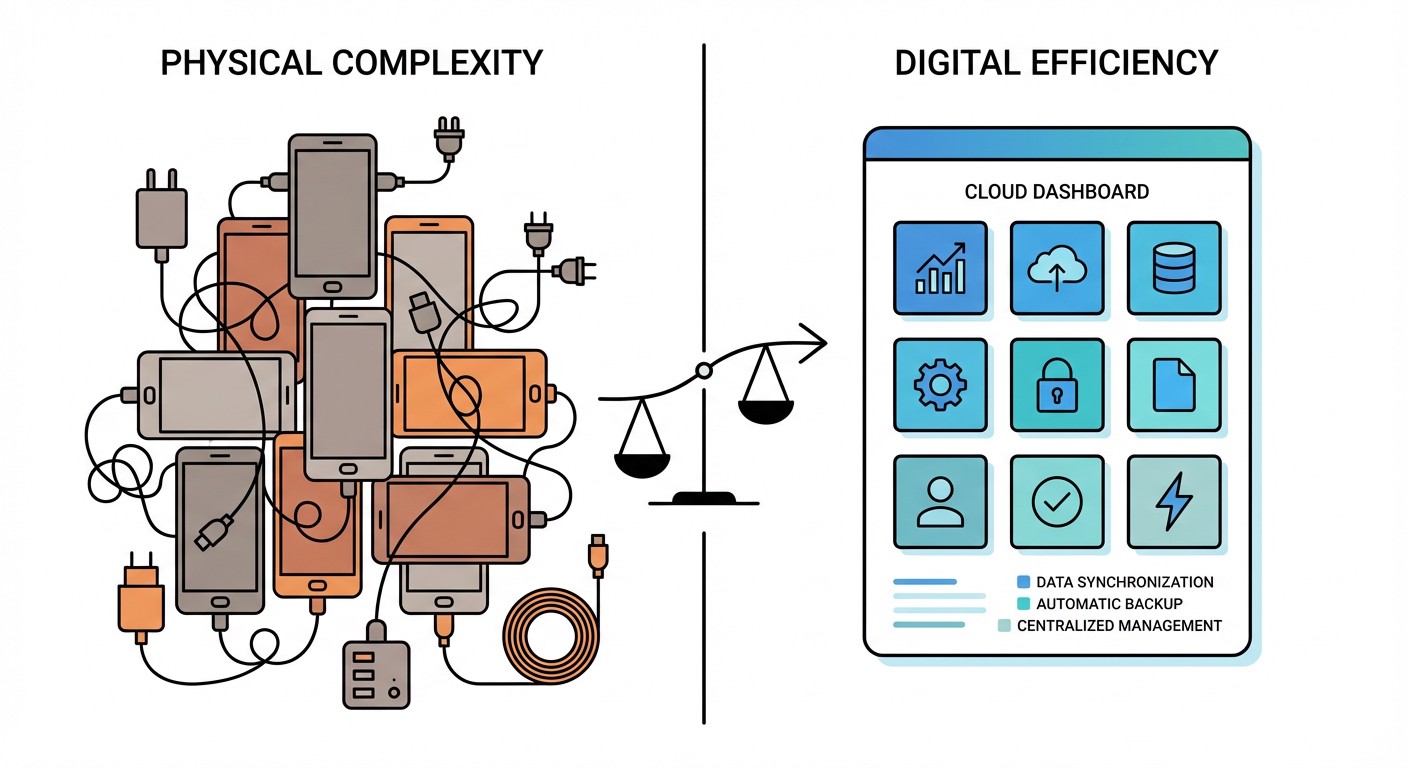 At first glance, these seem comparable. But factor in the hidden costs: the traditional approach requires physical space for 9 phones, 9 charging cables, 9 power outlets, and the hassle of managing 9 separate devices physically. When one phone's battery swells or hardware fails, you're looking at immediate replacement costs and setup time.