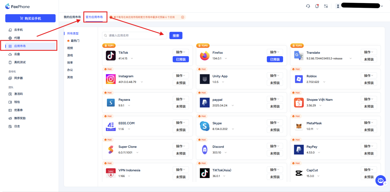 Method 1: Application Market:The cloud phone has a built-in application market, and you can search and download directly.