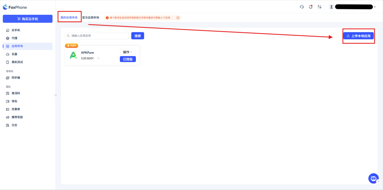 Method 2: Local upload: Still in the app market interface>select my app market Click on the toolbar [Upload local application] button, select the .apk file on your computer, and the system will automatically install it.