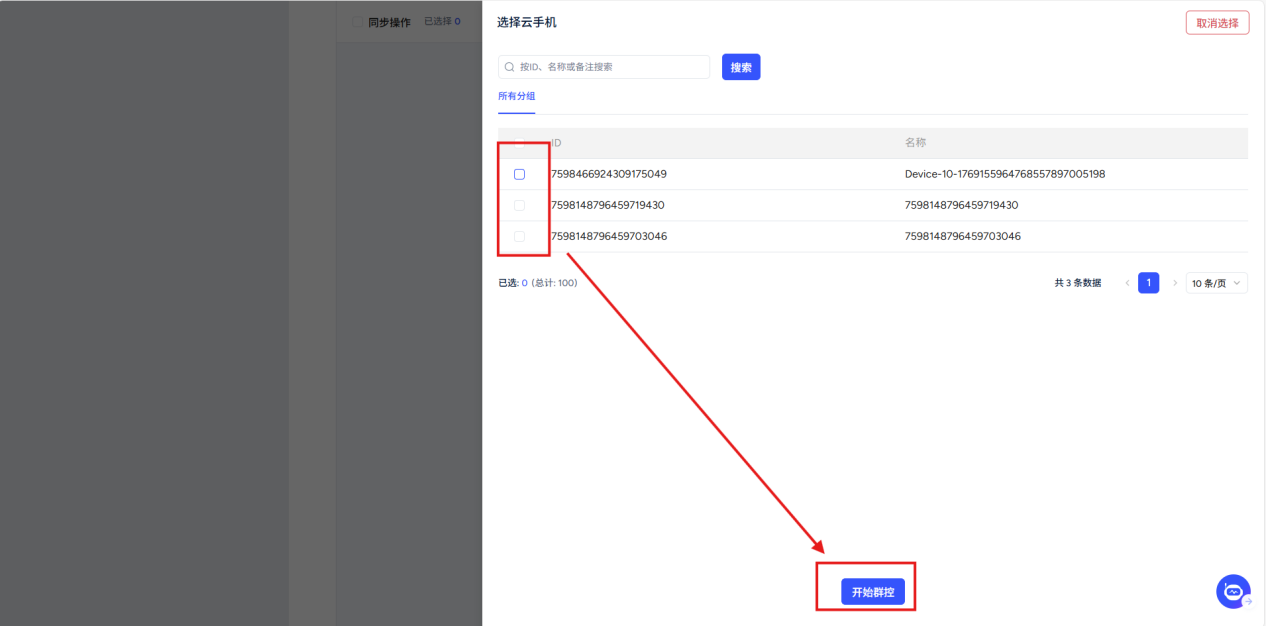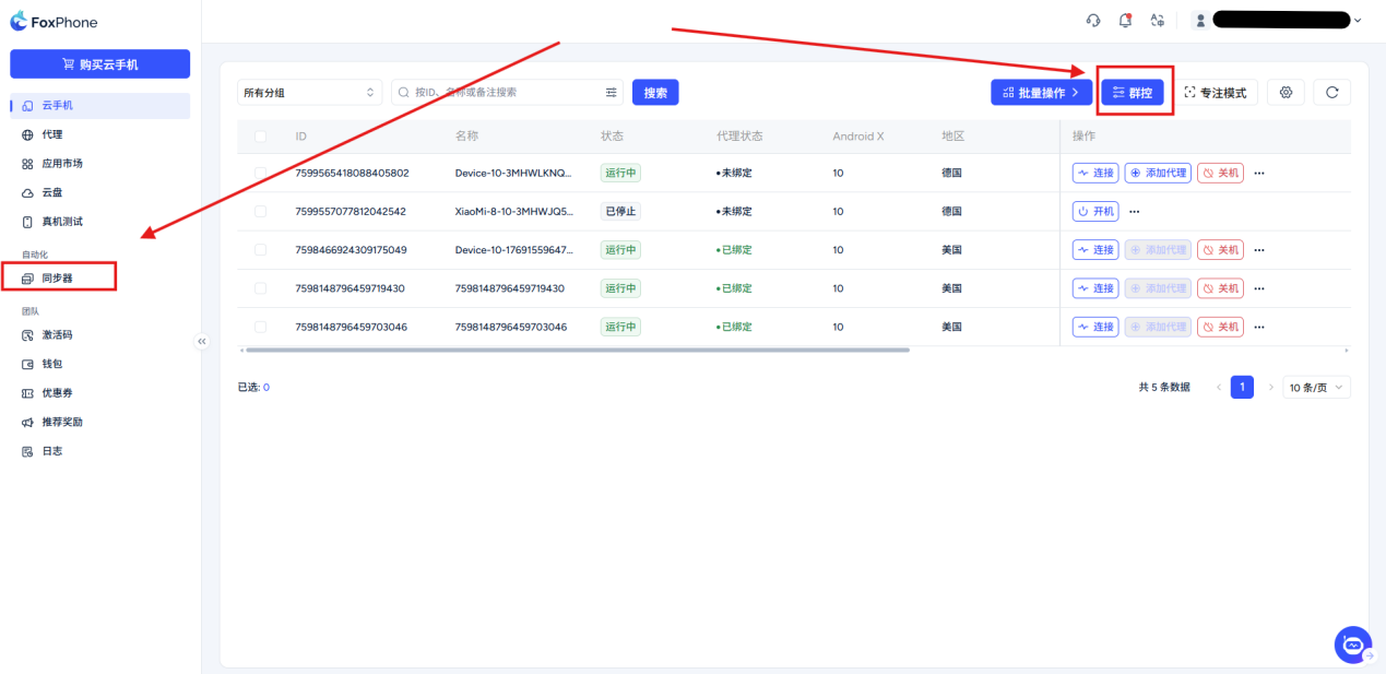 Step2:Click on the left navigation bar [synchronizer] or above the cloud phone device list [Group control] button.
