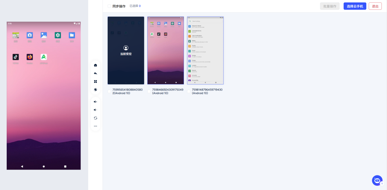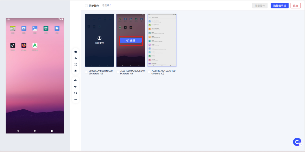 Interface description: The left area is the main control window, and the right window displays the real-time images of all selected cloud phones.