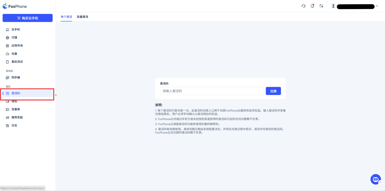 5. If the activation code is not redeemed within 90 days, it will automatically expire. Please redeem in time to avoid expiration, FoxPhone Cloud assumes no responsibility for expired activation codes.