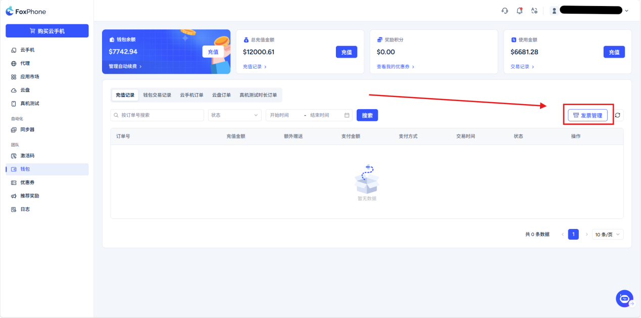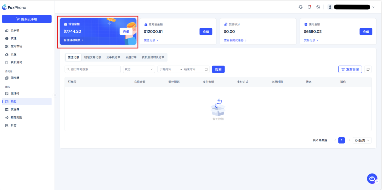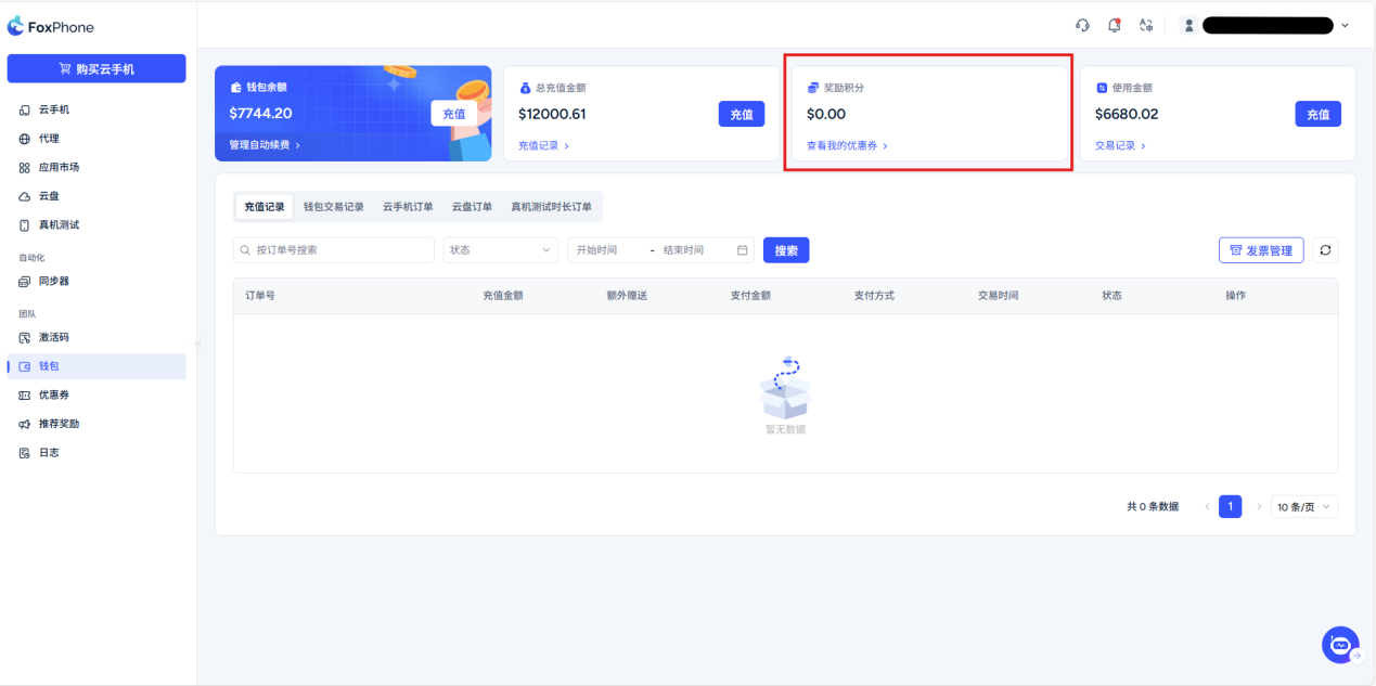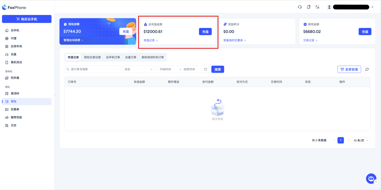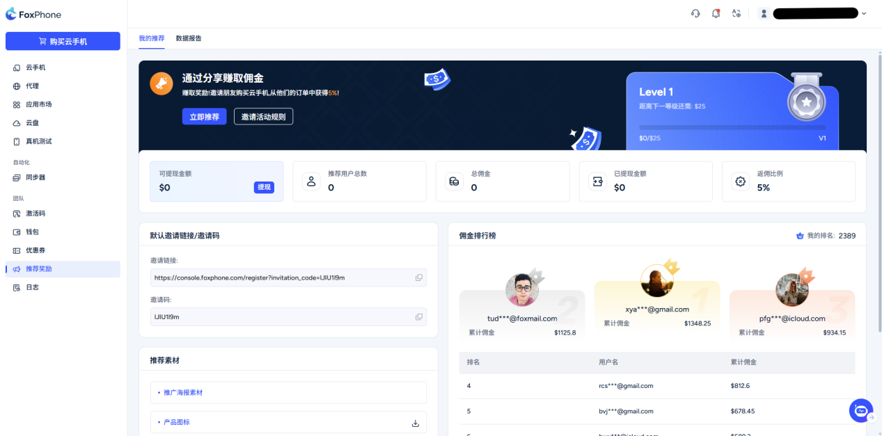 Share rebate program: When you complete the account registration, the system will automatically generate a promotion link and promotion code on this interface. Users who register and purchase cloud phones through your sharing link or code will receive a 5% rebate commission on the invited user's order. You can check and withdraw rebates on this interface.