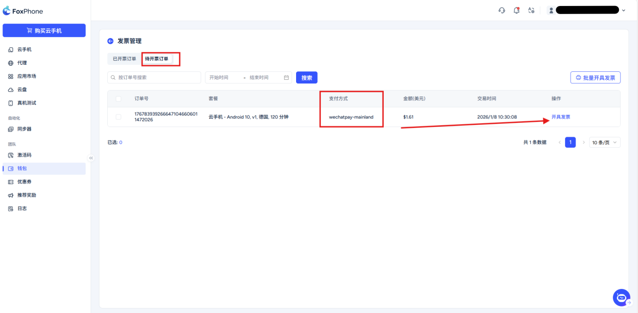 For orders with payment methods other than wallet balance, you can choose to issue an invoice in the order to be issued, or you can use the batch invoice button in the upper right corner to perform batch operations.