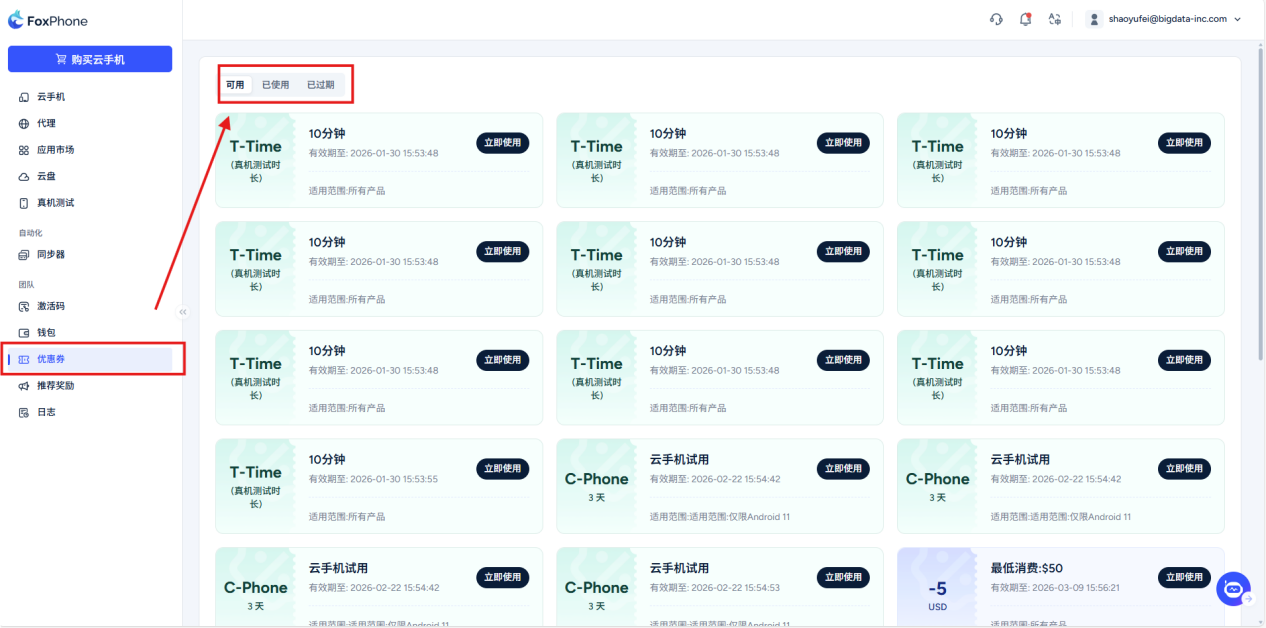 Coupon: Select the coupon interface to see the currently available/used/expired coupons