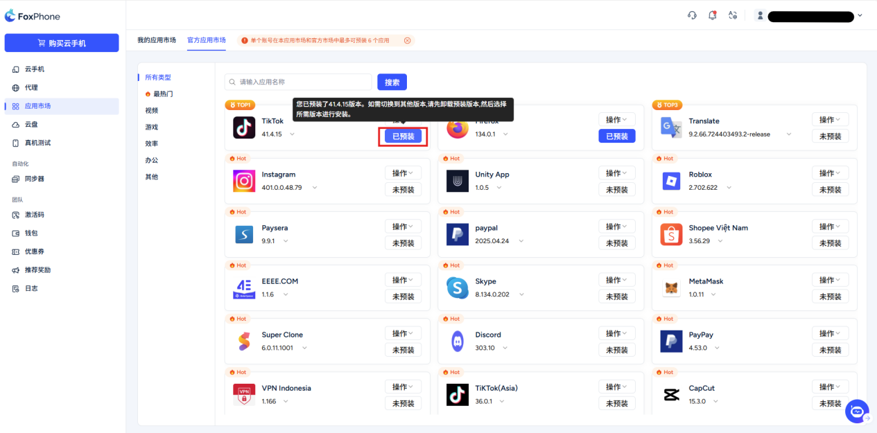 Note: A single account can pre-install up to 6 applications in this application market and the official market.