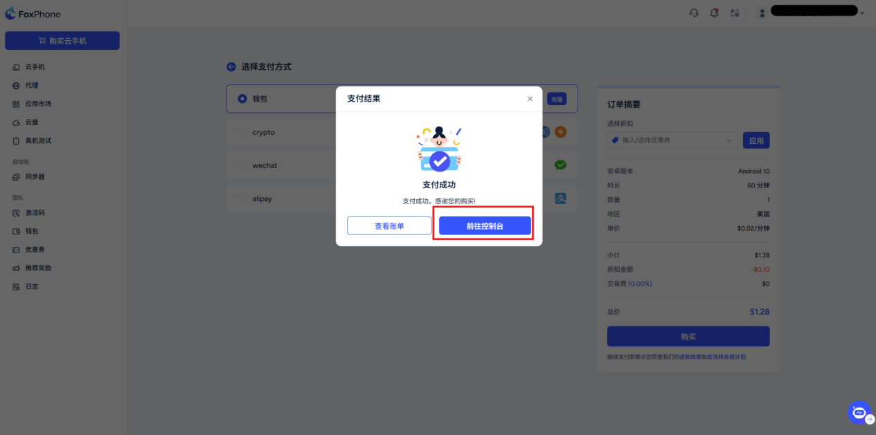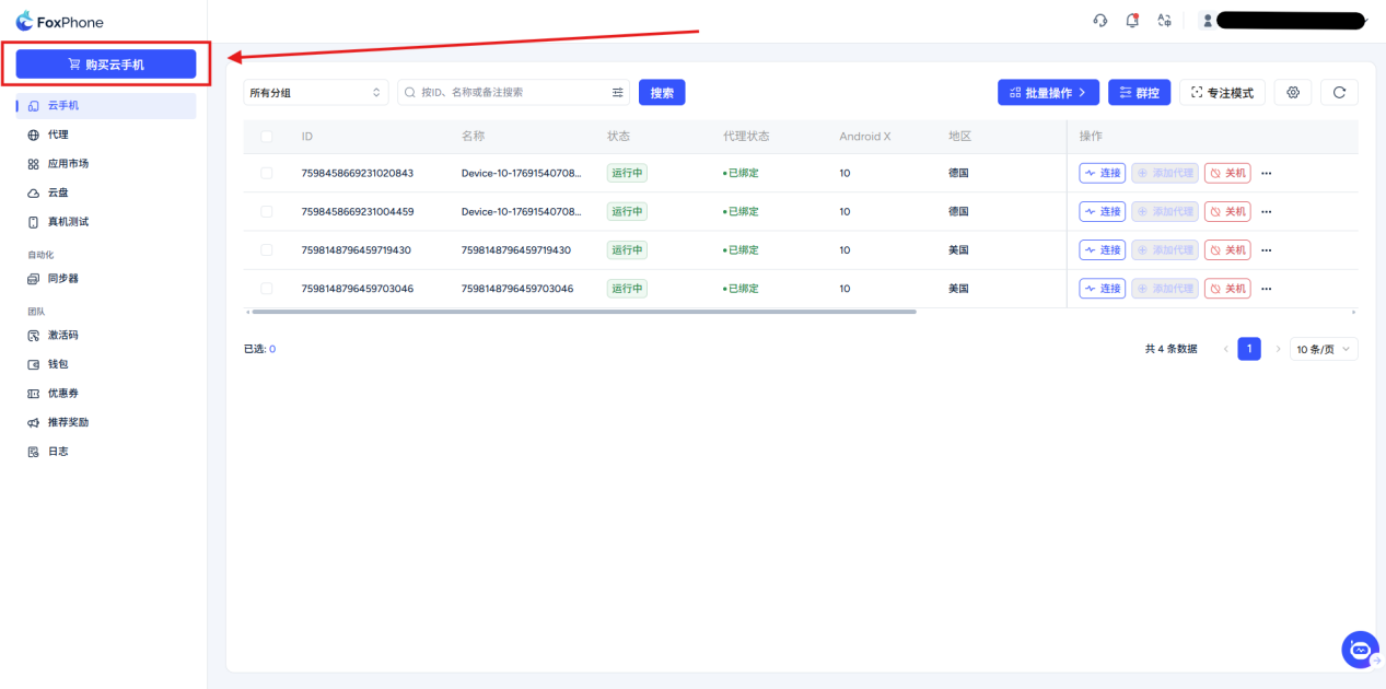 On the console page, click [Buy Cloud Phone].