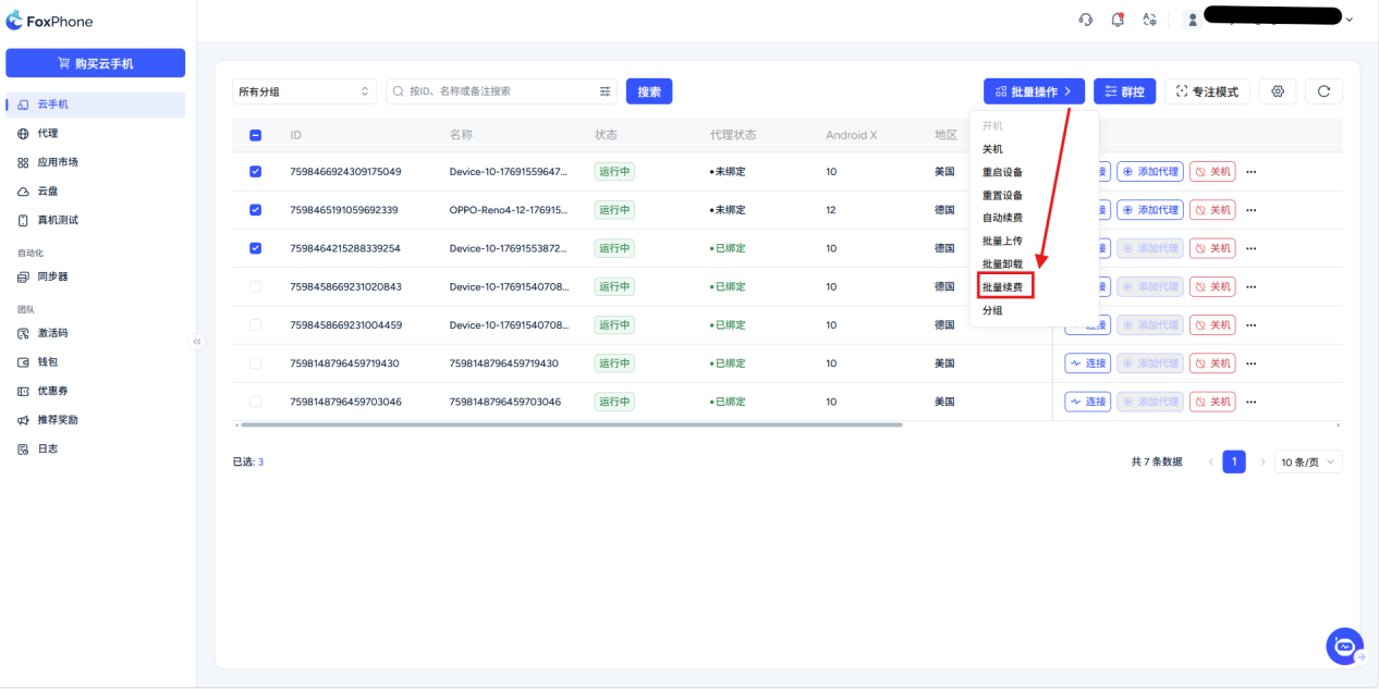 Batch renewal: Check multiple devices in the device list and click on the top [Batch operation] -> [Renewal].