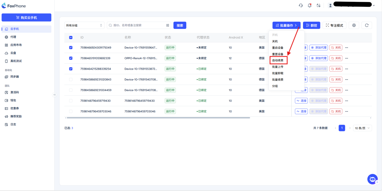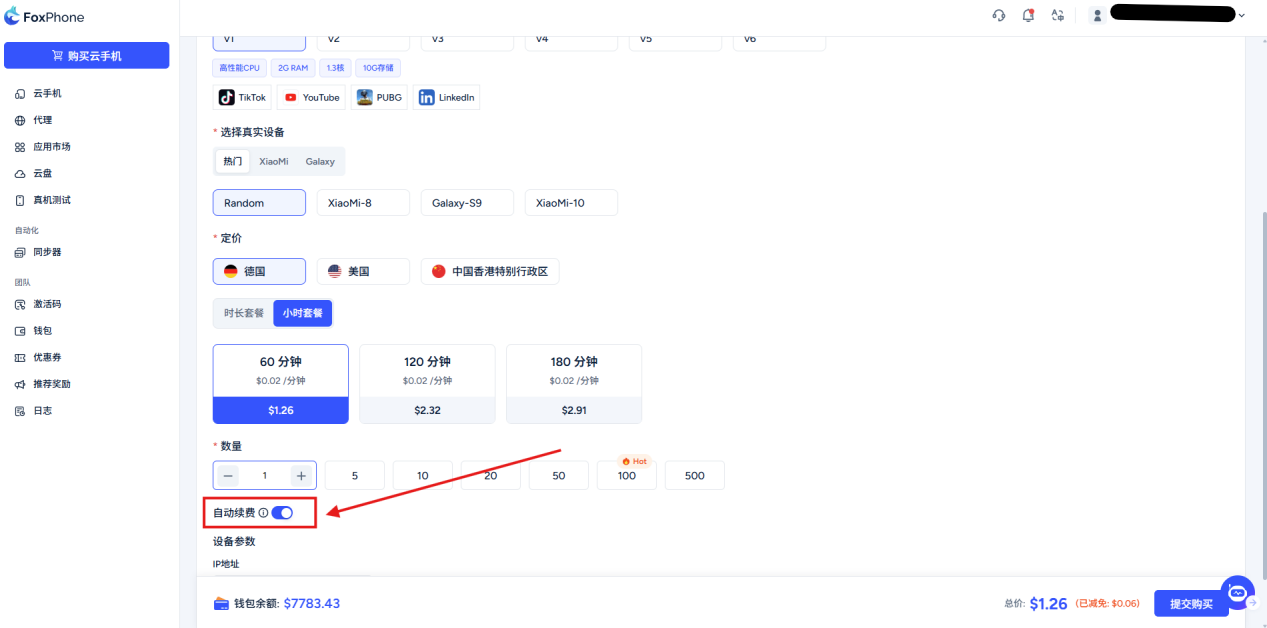 Select the automatic renewal button at the bottom and turn on automatic renewal for your cloud phone (30 days, regardless of hourly billing or day-based billing package)
