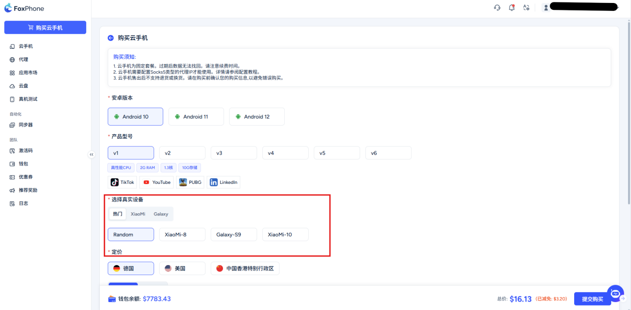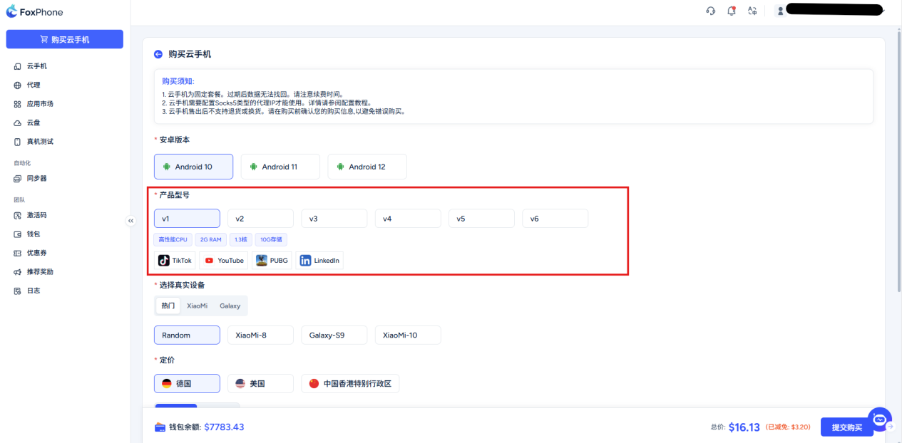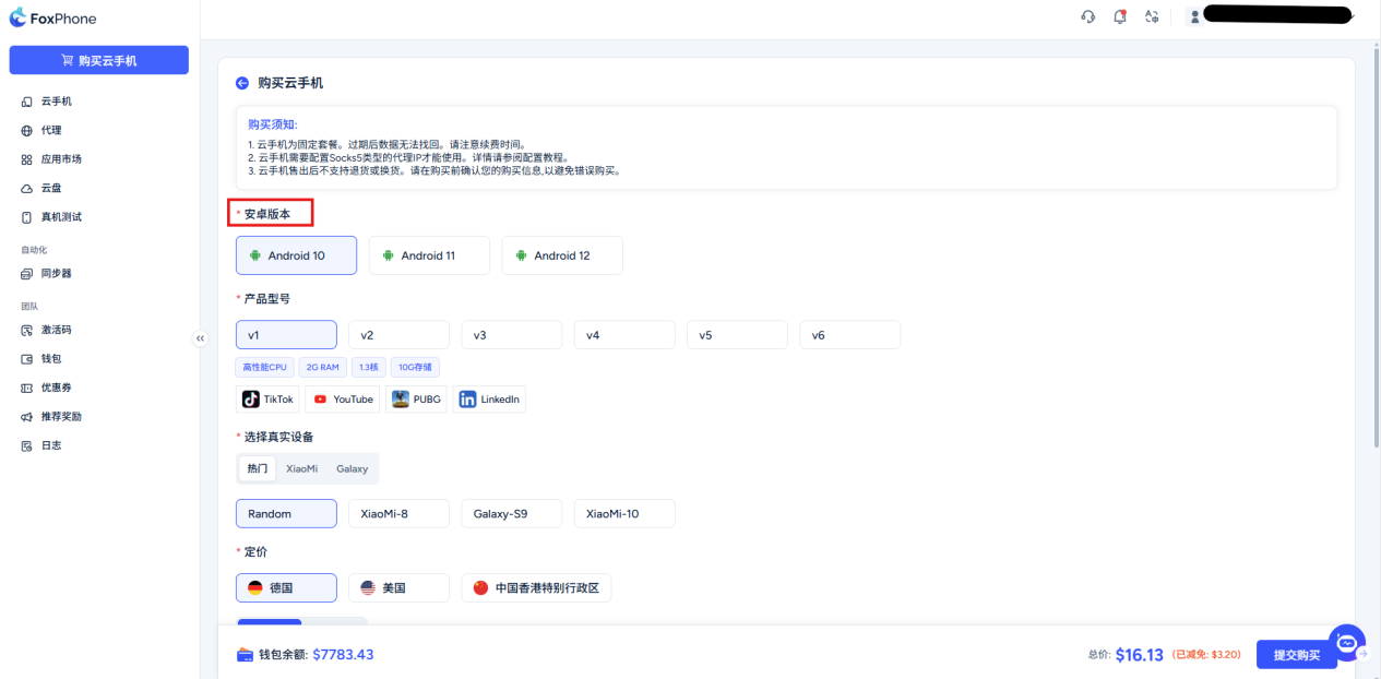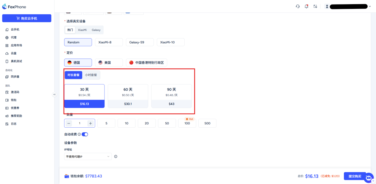 Check whether your Android version, product model, IP address package type and quantity are correct, the system will automatically calculate the price (note: packages are divided into time-based billing and hourly billing, please choose as needed)