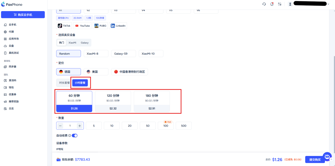 Quantity selection:Choose a cloud phone based on your needsNumber of units, you can select or enter manually