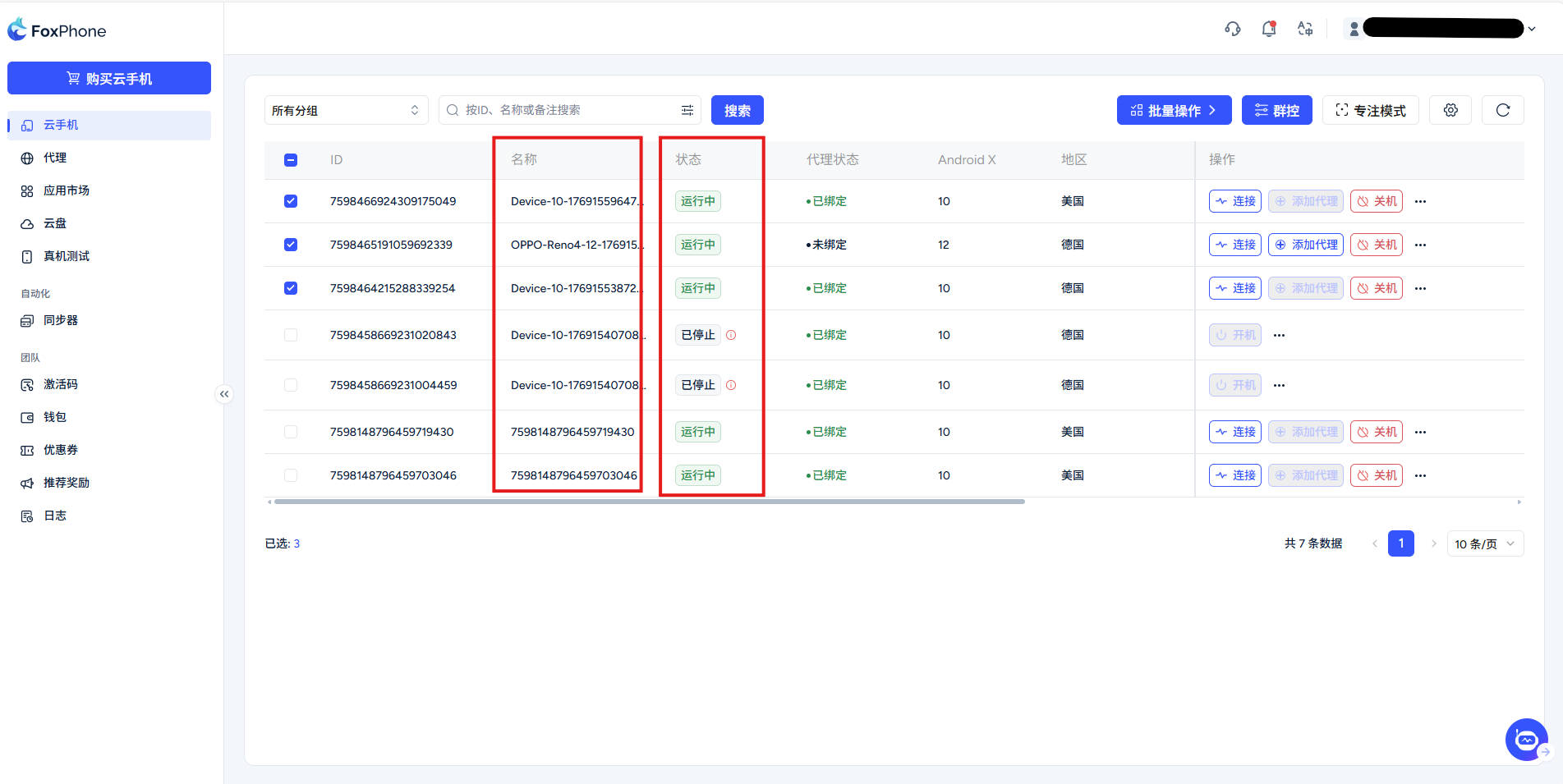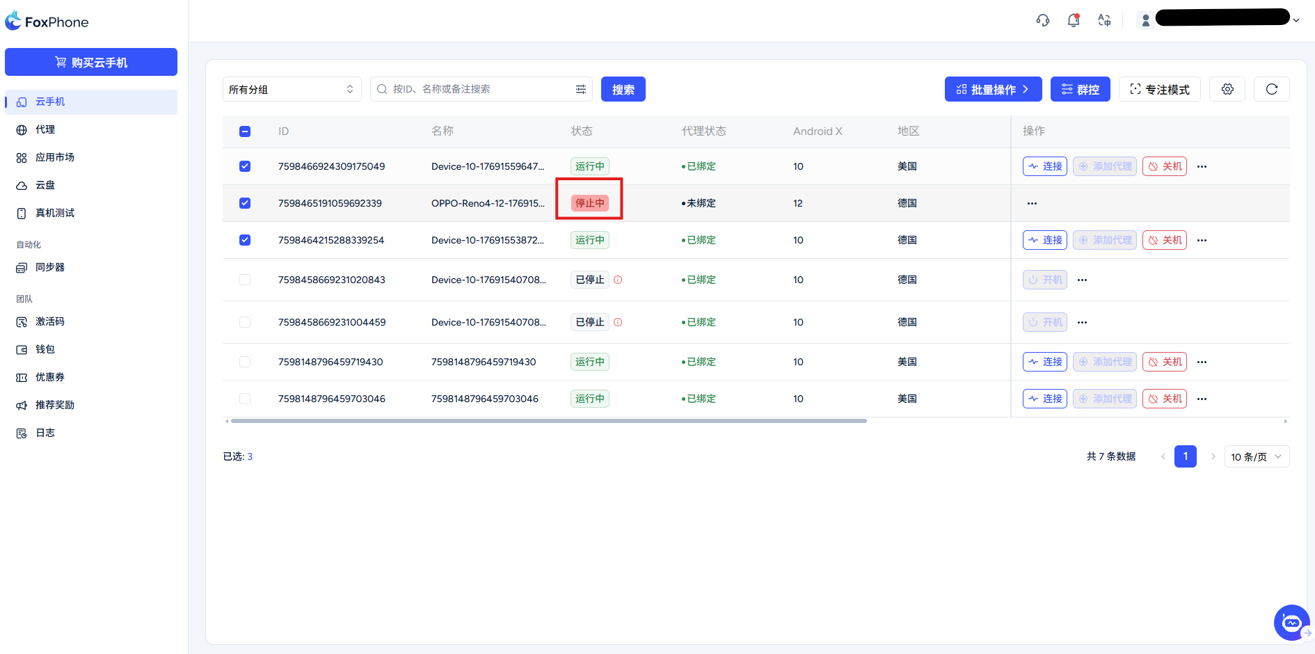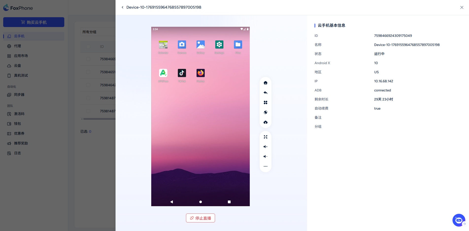 [Disconnect]: Disconnect the real-time image transmission between your local device and the cloud server. Stopping streaming just closes the "window" for your observation and control, inside the cloud phone Apps (such as idle games and automatic brushing scripts) usually continue to run in the cloud background and will incur time charges.