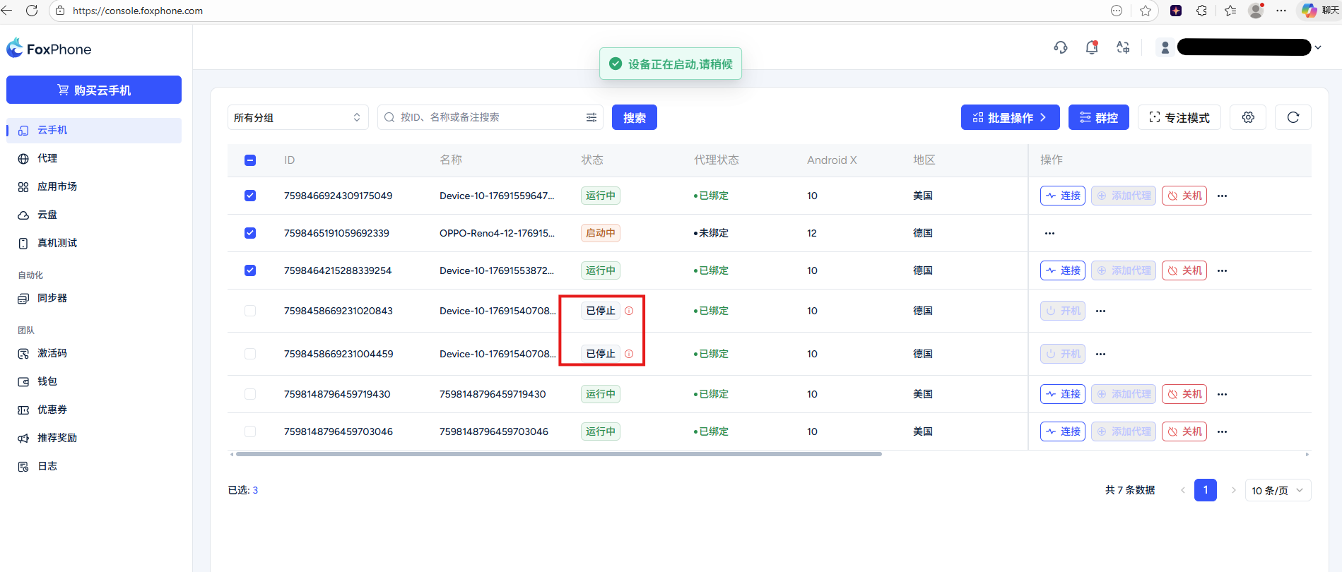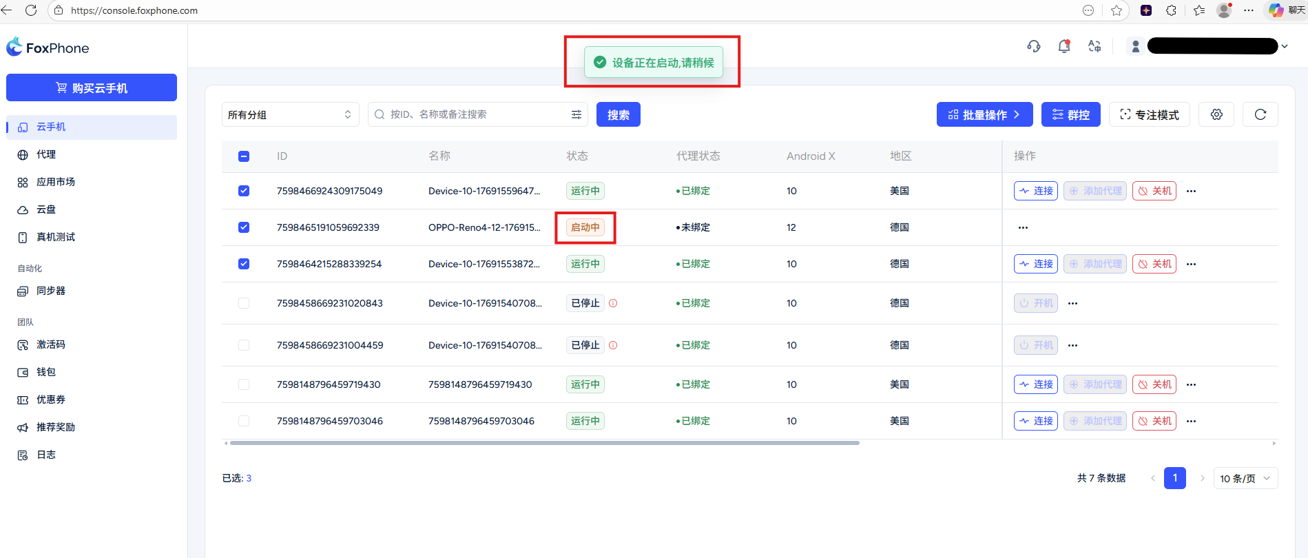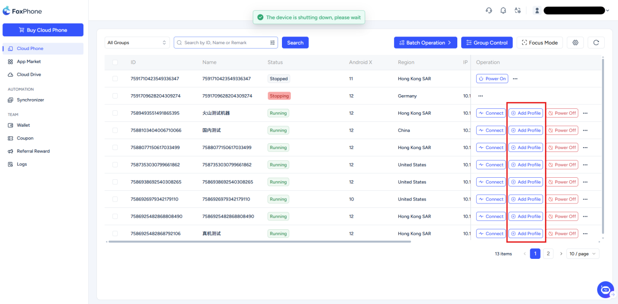 [Power on/off]: Press this button when you need to open or end all processes or completely close the cloud phone, and the status bar will display [Starting up / shutting down],start/stopThe process end status bar will change to [Running/Shut down]